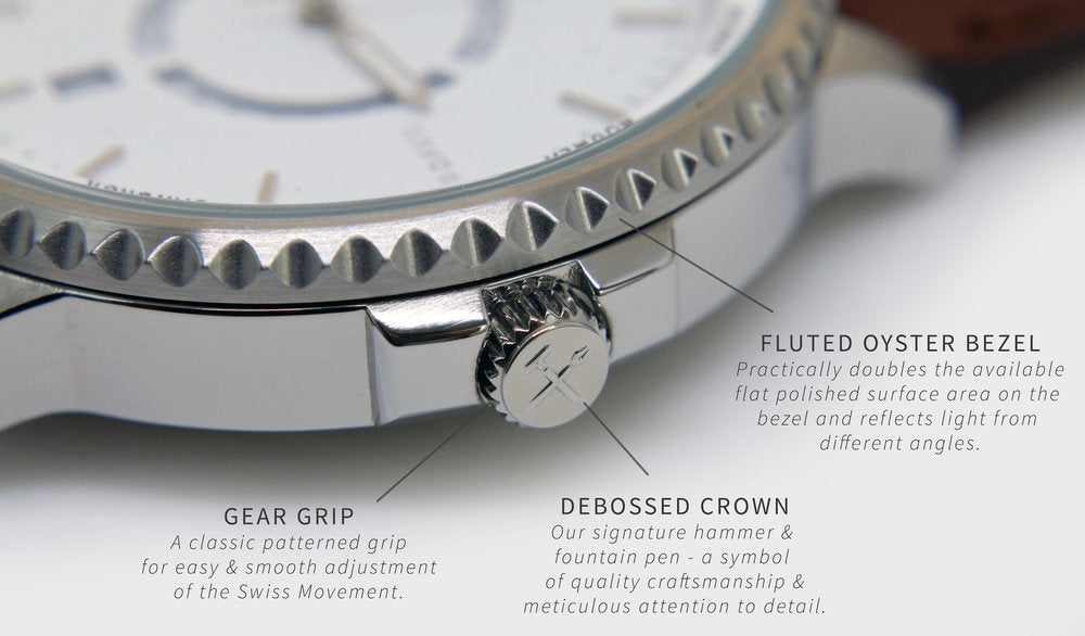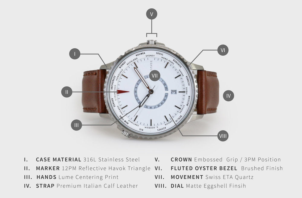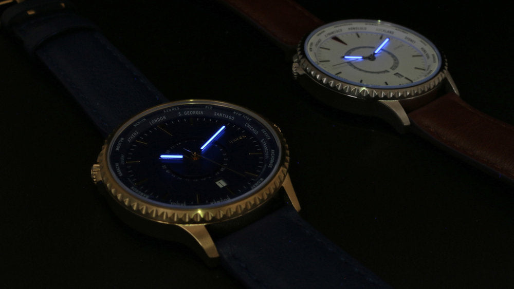 Our world timer shows the time for the main 24 time zones simultaneously whereas a traditional GMT can only monitor one other selected time zone. True world time watches traditionally cost upwards of $5,000 to $20,000, however we devised a new kind of solution. Using a clever dual-layer rotating disc system, we are able to reverse engineer the first quartz hybrid world timer using a Swiss GMT movement.